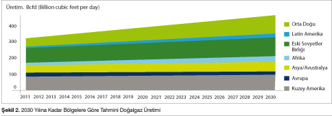 "Raporda, sınırların çok iyi tanımlanmadığı bölgelerde şirketlerin ve benzeri şekilde ülkelerin petrol ve gaz aramaları yapmaları sonucunda jeopolitik sorunların artacağı vurgulanıyor" "Orta Doğu’daki Doğalgaz Üretim Hızı Yaklaşık 3 kat Artacak" Şekilde 2’de bölgelere göre tahmini doğalgaz üretimi görülmektedir. Referans senaryodaki varsayımlara dayanarak, bölgenin muazzam kaynaklarının ve ihracat kapasitesinde öngörülen artışın doğrudan bir sonucu olarak, artan tedarikin büyük bir bölümünü Orta Doğu’nun sağlayacağı tahmin edilmektedir. Önümüzdeki 20 yılda Orta Doğu’daki üretim hızının yaklaşık 3 kat artacağı tahmin ediliyor. Bu üretimin bir bölümünün hemen büyüyen yerel pazarlara verileceği tahmin edilirken, kalan bölümünün LNG ya da boru hatları aracılığıyla diğer bölgelere gönderilmesi beklenmektedir.
