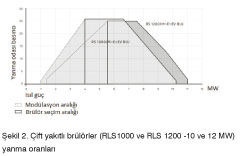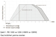 1. 12 MW’a Kadar Yüksek Güç Riello’nun genel kullanım maksatlı ürettiği R-300-800 serisi brülörleri bu güne kadar 8 MW güce kadar mevcuttu. Bu seri şimdi iki yeni modelle güncellenmiş oldu ve maksimum kapasite 12 MW’a kadar yükseldi. Böylece yeni seri daha rekabetçi ve piyasada ortaya çıkan farklı ısı ve buhar üretimi taleplerini karşılayacak duruma geldi. Bu yeni brülör modelleri de Riello’nun kendisine özgü güvenli yanma ve sağlamlık özelliklerini taşımakta ve brülörleri kapasite kontrolü ve havalandırma teknolojisi üzerine en gelişmiş çözümler için uyumlu hale getirmektedir. Bunun sonucu olarak kullanıcılara 12 MW’lık önemli bir güç kullanıcı dostu monoblok bir gövde içinde, montaj ve servis kolaylığı, güvenli işletim ve çevre dostu emisyon özellikleriyle beraber sunulmaktadır. Yeni gaz ve çift yakıtlı modeller farklı hava-yakıt oranı düzenlemeleriyle sunulmaktadır. Brülörün oransal çalışması en basit olarak hava ve yakıta aynı kam düzeneği ile mekanik olarak ayarlanır. Daha yüksek seviyede performans; verim, hava ve yakıtı ayrı servo motorların kontrol ettiği elektronik kamlı sistemle ve ilave olarak düşük gürültü seviyesi ve elektrik tasarrufu değişken sürat teknolojisi kullanılarak elde edilir.İstenilen güç, yüksek verimli ve kararlılığını muhafaza edecek şekilde, beraberinde düşük yakıt tüketimi ve azaltılmış işletme giderlerini de sağlayarak temin edilir. Riello’nun R-1000-1200 modelleri Avrupa Standardı EN 676 Klas 3’e göre çevre dostu düşük NOx emisyonu yapar.Brülörlerin kullanılabildikleri kapasite aralıkları aşağıdaki grafiklerde görülmektedir.
