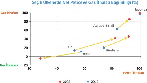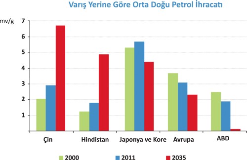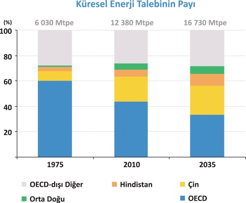 ïµKüresel enerji piyasalarını yükselen ekonomiler yönlendiriyor. OECD dışı ülkelerin enerji talepleri 2010 yılında %55 iken, bu oran 2035 yılına kadar %65’e kadar yükselecek. Küresel enerji kullanımında en büyük büyüme 2035 yılına kadar %60’a çıkacak olan Çin tarafından gerçekleştirilecek. Bunu Hindistan (talep iki mislinden daha fazla olacak) ve Orta Doğu takip edecek. OECD ülkelerindeki talep ise 2035 yılına kadar 2010 yılına göre sadece %3 artış gösterecek, ancak bu ülkelerde kullanılan yakıt karışımı büyük oranda değişiklik gösterecek. Petrol ve kömür kullanımı yüzde on beş puanlık bir düşüş göstererek %42’ye düşecek.