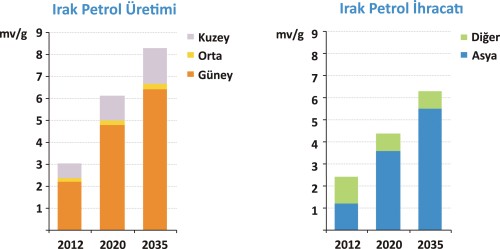 Irak’ın petrol ve gaz üretimini artırma hedefleri, hidrokarbon rezervlerinin boyutları veya üretim giderleri ile kısıtlanmalıdır. Sektörün gelişimi, yatırımları yavaşlatan engellerin ne kadar hızlı biçimde kaldırıldığı, Irak’ın hidrokarbon zenginliğinden uzun dönemde ne şekilde yararlanmayı planladığının netliği, uluslararası piyasa şartları ve Irak’ın politik istikrarı sağlaması ile insan kaynakları tabanını geliştirmesine bağlı olacaktır. Ana Senaryomuzda, WEO - 2012’nin Irak ile ilgili bölümleri bulunan Yeni Politikalar Senaryosu’nda, Irak’ın petrol üretimi 2020 yılına kadar iki katı artarak günde 5 milyon varile çıkmakta, bu rakam 2035 yılında günde 8,3 milyon varile ulaşmaktadır. Üretimdeki en büyük artış Basra çevresinde, Irak’ın güneyindeki devasa süper sahalardan gelmektedir. 2035 yılına kadar geçen süre zarfında günde 5 milyon varilin üzerine çıkan Irak petrol üretim artışı, küresel arz artışına en büyük katkıyı sağlamakta (dünyadaki üretim artışının %45’ine denk gelmektedir), 2030 yılında Irak Rusya’yı geçerek dünyanın ikinci en çok petrol ihraç eden ülkesi konumuna gelmektedir. Irak’ın üretim kapasitesindeki artış Irak’ın, başta Çin olmak üzere hızla büyüyen Asya ülkelerinin ana tedarikçisi konumuna gelmesi demektir.