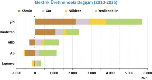 Yeni Politikalar Senaryosu’nda elektriğe olan talep büyümeye devam ediyor ve 2035 yılına kadar yaklaşık %70 artış göstererek 32000 TWs’e ulaşıyor. Artışlar büyük çoğunlukla OECD dışı ülkelerden geliyor, bunun yarıdan fazlası da sadece Çin ve Hindistan’dan kaynaklanıyor. Elektrik üretiminde, özellikle de OECD dışı ülkelerde, kömür bel kemiği olmaya devam ediyor, ancak kömürün karışım içindeki payı beşte ikiden, üçte bire düşüyor. OECD ülkelerinde ise, kömüre dayalı elektrik üretimi düşüyor ve 2035 yılına kadar kömürün yerini gaz ve yenilenebilir enerji kaynakları alıyor. 2035 yılına kadar yenilenebilir enerji kaynaklarından elde edilen elektrik üretimi 2010 yılına göre yaklaşık üç katına çıkıyor, elektrik üretimi karışımı içindeki payı artarak %20’den %31’e yükseliyor. OECD ülkelerindeki yenilenebilir enerji kaynakları ile elektrik üretimi asıl olarak rüzgar (%47), biyoenerji (%16), güneş enerjisi (%15) ve hidrolik enerji (%11) oluyor. OECD dışı ülkelerde ise hidrolik enerji %42 ile yenilenebilir enerji kaynakları kullanımındaki artışta başı çekerken, rüzgar (%25), biyo (%16) ve güneş (%10) enerjilerinin de önemli katkısı oluyor.