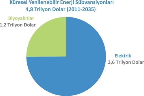 Yenilenebilir enerji kaynakları hala alışılmış kaynaklardan daha pahalı olduğundan, yenilenebilir enerji sektöründe, özellikle de elektrik üretimi sektöründe büyüme sağlanabilmesi için enerji sübvansiyonları gereklidir. 2011 yılında, Avrupa Birliğinde, özellikle de Almanya ve İtalya’da güneş enerjisinden elektrik üretiminin olağanüstü bir biçimde artış göstermesi nedeniyle, enerji sübvansiyonları 2010 yılına göre %24’lük bir artış göstermiş ve 88 milyar ABD dolarını bulmuştur. Outlook süresi sonuna doğru, Avrupa Birliği ve Çin’deki karasal rüzgâr enerjisi üretimi gibi bazı yenilenebilir enerji teknolojileri bir dereceye kadar rekabet edebilir duruma gelmiş olsalar dahi, yenilenebilir enerji alanındaki hızlı büyüme, sübvansiyonların 2035 yılına kadar yaklaşık 240 milyar ABD dolarına çıkması anlamına gelmektedir (bunun yaklaşık 180 milyar ABD doları elektrik üretimi, geriye kalanı ise biyoyakıtlar içindir). Yenilenebilir kaynaklardan elde edilen elektrik üretimi için gerekli olan sübvansiyonların 2012-2035 yılları arasındaki toplamı 3,5 trilyon ABD doları olup, bunun hali hazırda dörtte biri mevcut kapasiteler için kullanılmış, yaklaşık %70’i ise 2020 yılına kadar gerçekleştirilmesi hedeflenen yatırımlara bağlanmış bulunmaktadır.