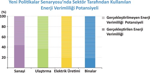 Enerji verimliliği enerji güvenliğini artırabilir, ekonomik büyümeyi teşvik edebilir ve çevre kirliliğini en aza indirgeyebilir, ancak mevcut ve planlanan çabalar ekonomik potansiyelin tamamına erişmenin çok gerisinde kalmaktadır. Geçen yıl içinde, önemli miktarda enerji tüketen bir takım ülkeler (Çin, Amerika Birleşik Devletleri, Avrupa Birliği ve Japonya) enerji verimliliği konusunda tedbirler aldı. Bu tedbirlerin uygulamaya konması sonrasında, Yeni Politikalar Senaryosu’nda, 2035 yılına kadar küresel enerji yoğunluğunda (birim GSYİH başına düşen enerji kullanımı) yıllık %1,8’lik bir katkı sağlanacağı hesaplanmaktadır ki, geçtiğimiz on yıl süresinde gerçekleşen %0,5’lik bir iyileşmeye oranla bu çok büyük bir gelişmedir. Yine de, teknik olmayan bir takım nedenlerden dolayı, enerji verimliliğine katkıda bulunabilecek, ekonomik potansiyeli yüksek bazı alanlara – bina sektörünün beşte dördü ve sanayinin yarısından fazlası – dokunulmamaktadır.